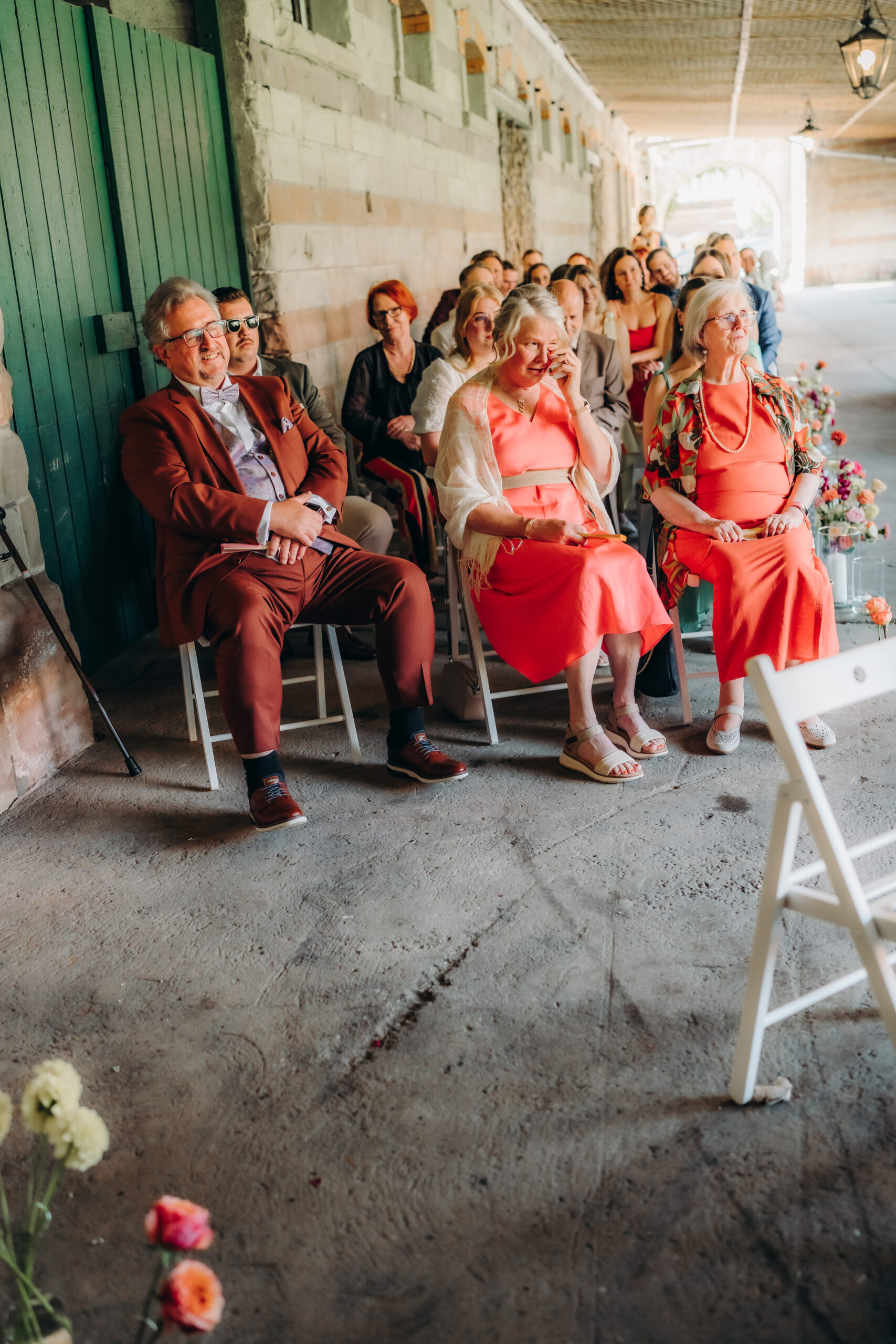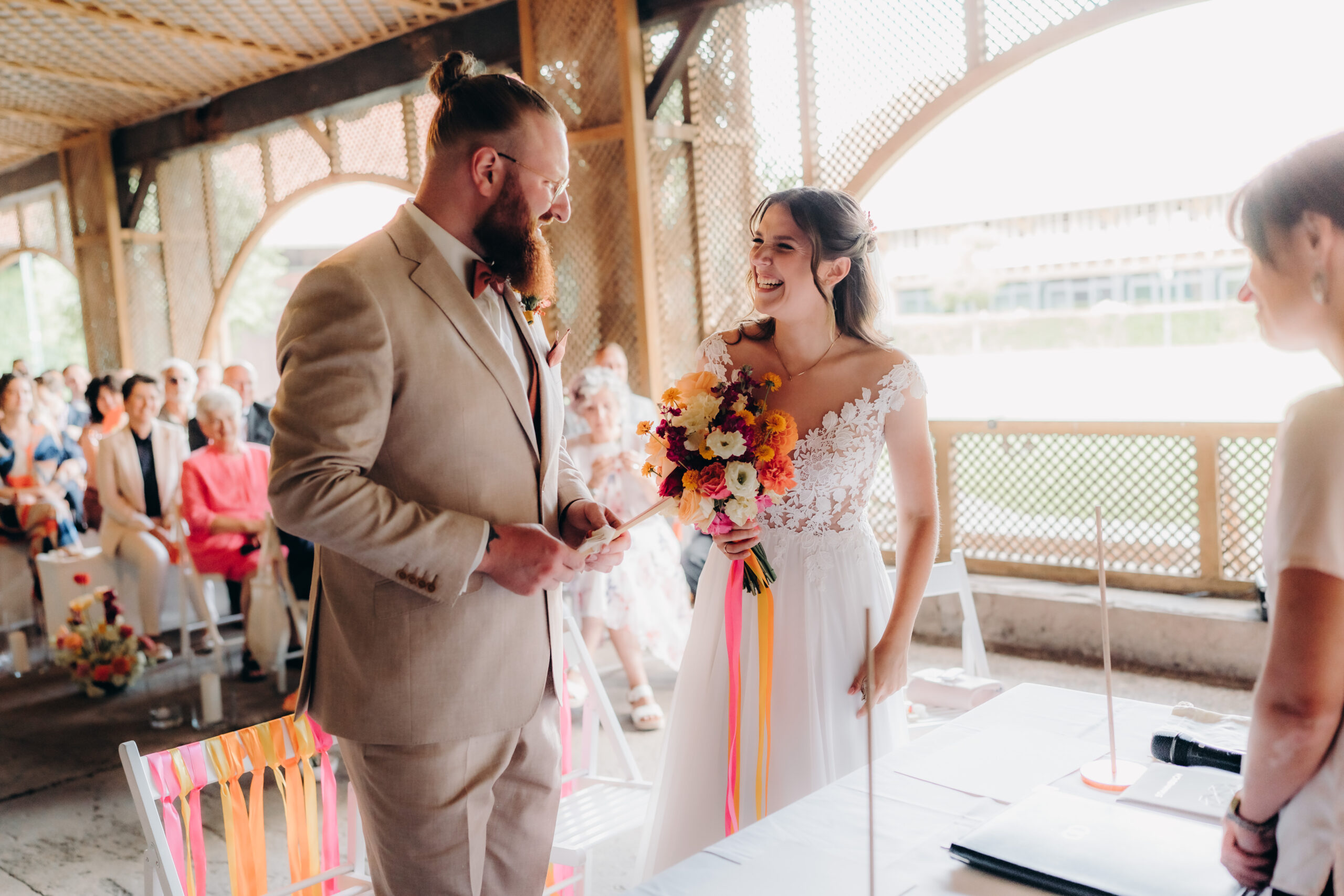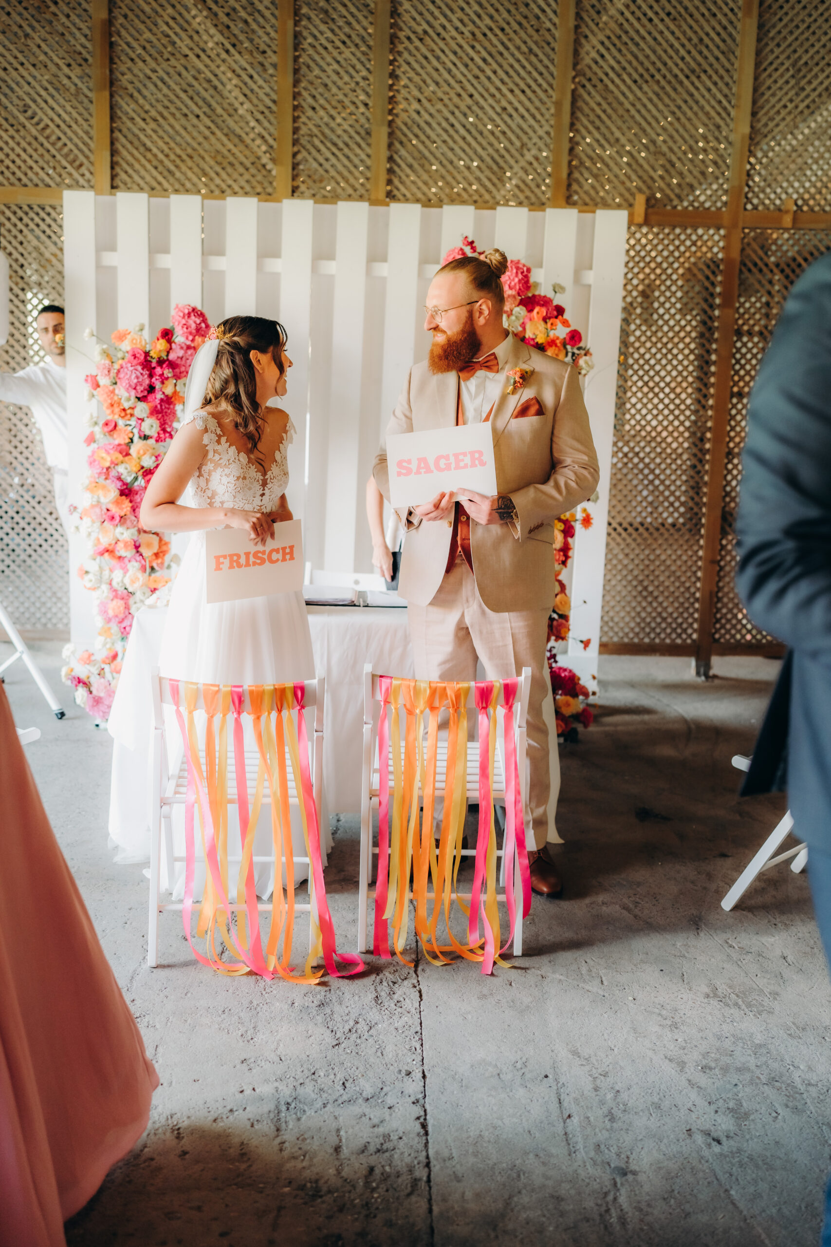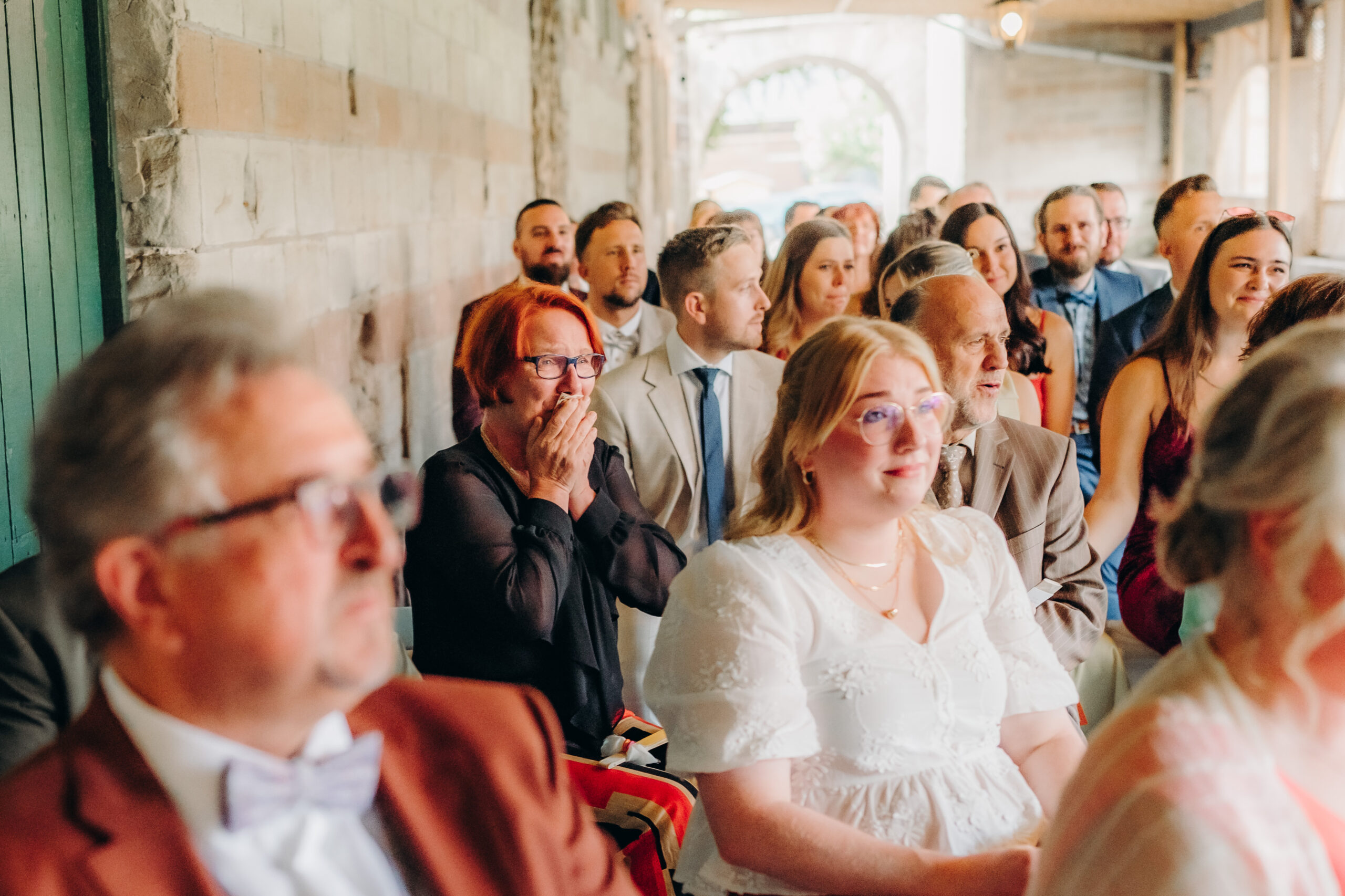 Die standesamtliche Trauung von Lena & Benedikt auf dem Linslerhof in Überherrn war ein absolut besonderer Moment. Die Zeremonie fand draußen statt und strahlte eine so persönliche, intime Atmosphäre aus, dass sie sich fast wie eine freie Trauung anfühlte.Die Kombination aus der liebevollen Gestaltung der Trauung, der wunderschönen Location und der lockeren Stimmung machte den Tag einfach perfekt. Jeder Moment war geprägt von Emotionen, Lachen und echten Verbindungen zwischen dem Brautpaar und ihren Gästen.